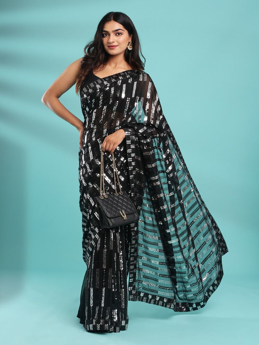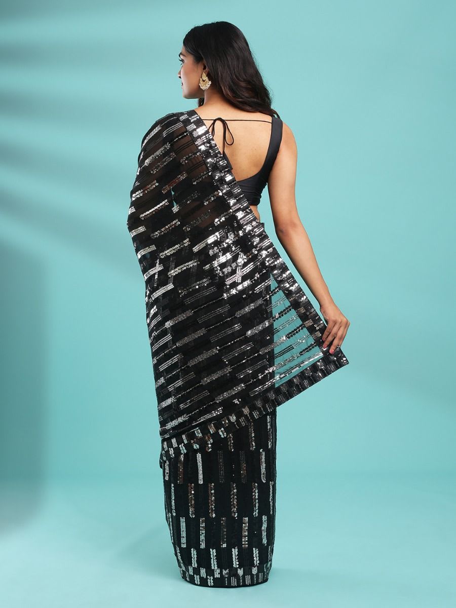 Item : Fancy Saree Saree Color : black Saree Fabric : georgette Saree Body Design : silver & black Sequence Shell Work Saree Border Design : lace border Saree Pallu Color: black Saree Pallu Design: silver & black Sequence Shell Work saree length : 5.5mtr Blouse : With Blouse Blouse Color : black Blouse Fabric : georgette Blouse Design : silver & black Sequence With Shell Work Occasion : Party Wear Wash & Care : Dry Clean