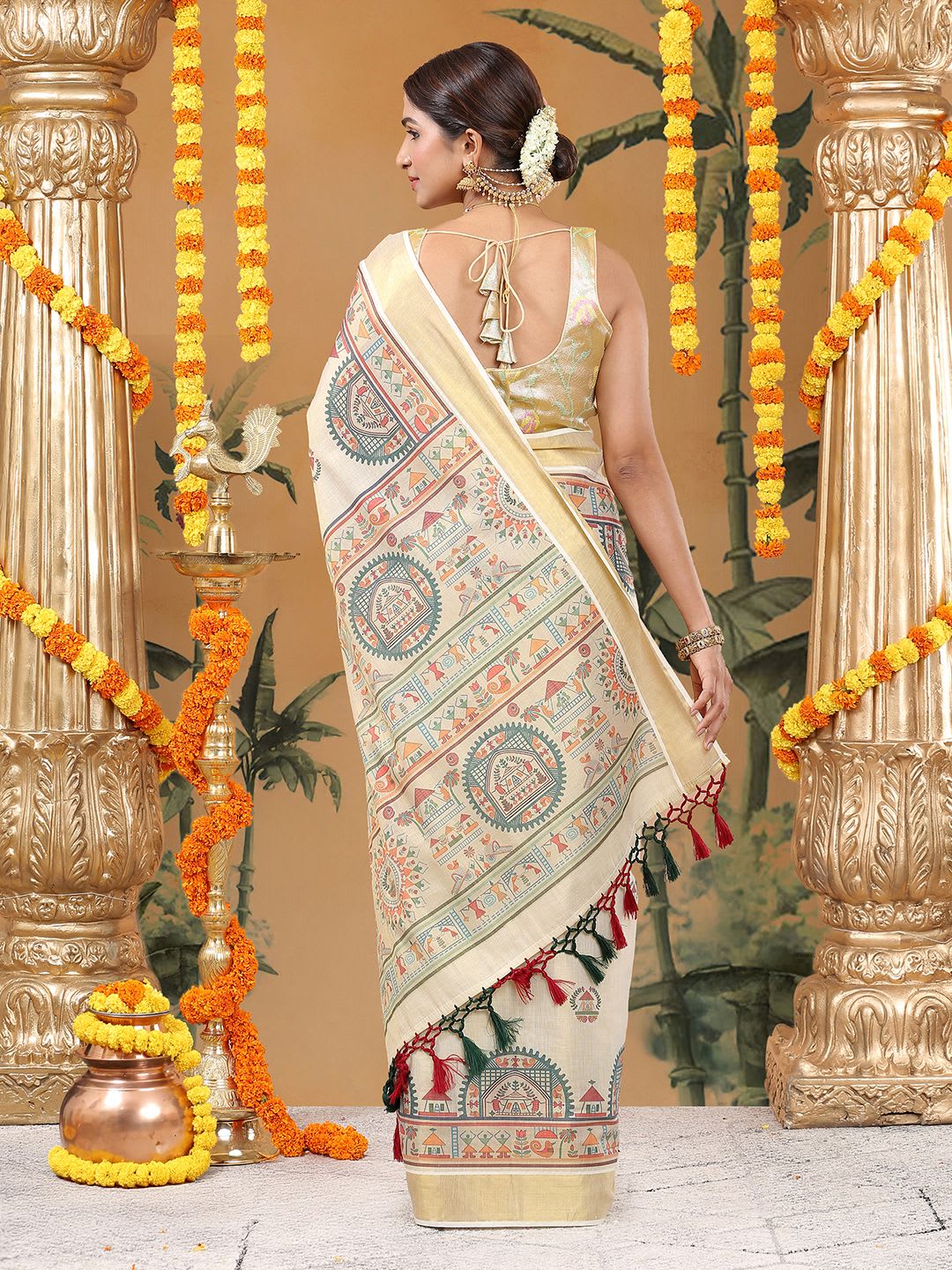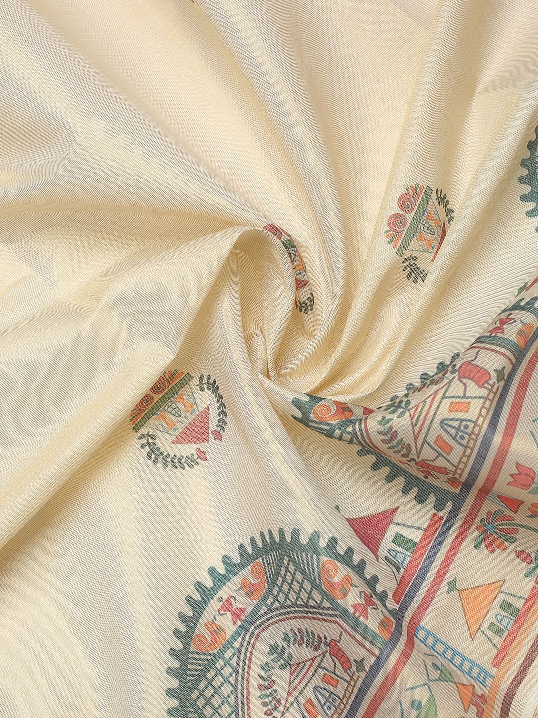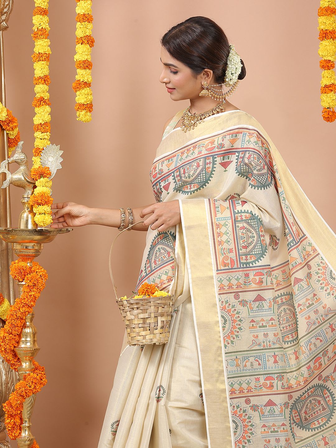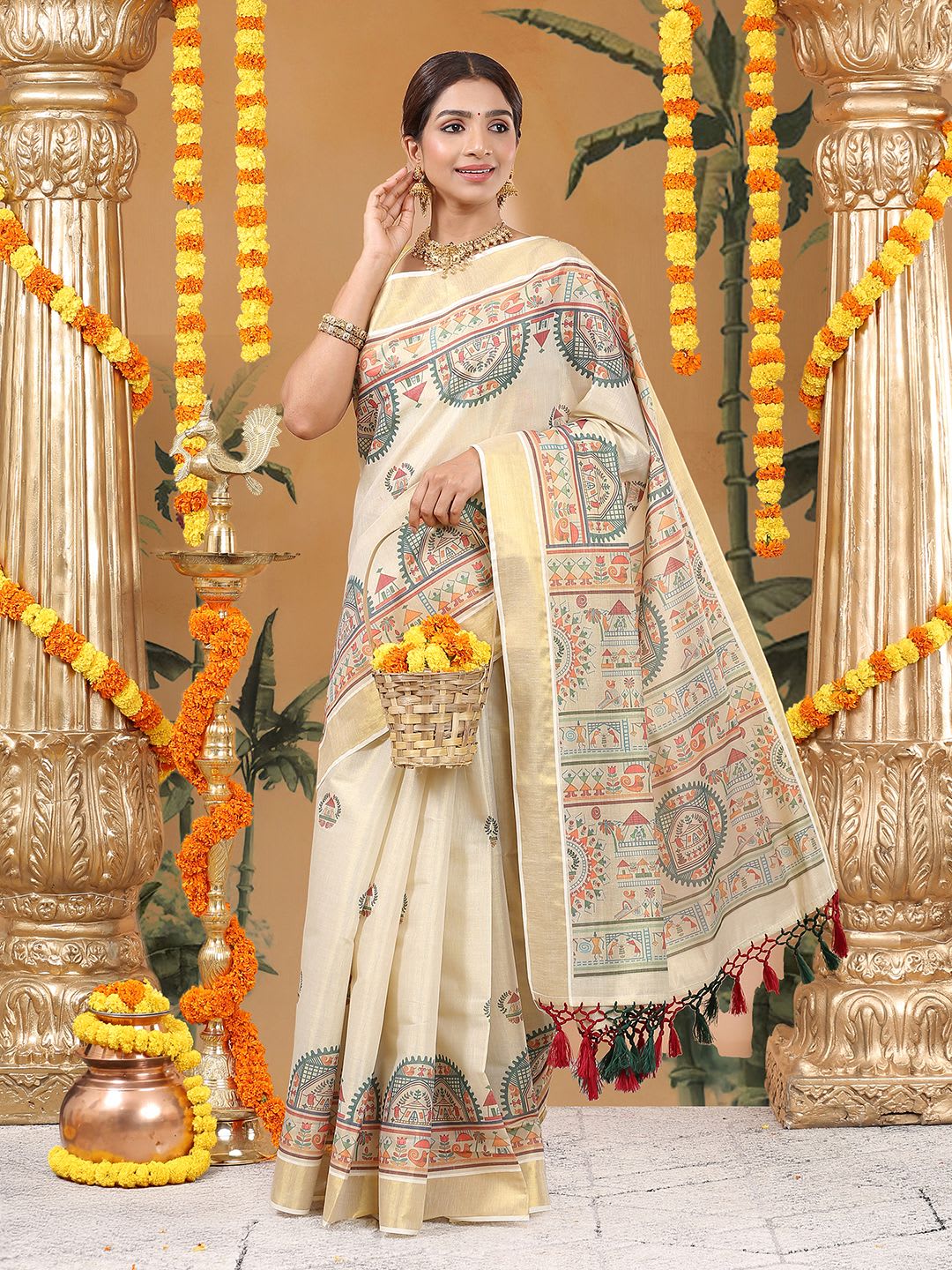 Size & Fit Length: 5.5 metres plus 0.8 metre blouse piece Width: 1.06 metres (approx.) Material & Care Dry Clean Specifications Ornamentation Warli Print Border Kasavu Blouse Fabric Tissue Blouse Blouse Piece Saree Fabric Tissue Wash Care Dry Clean