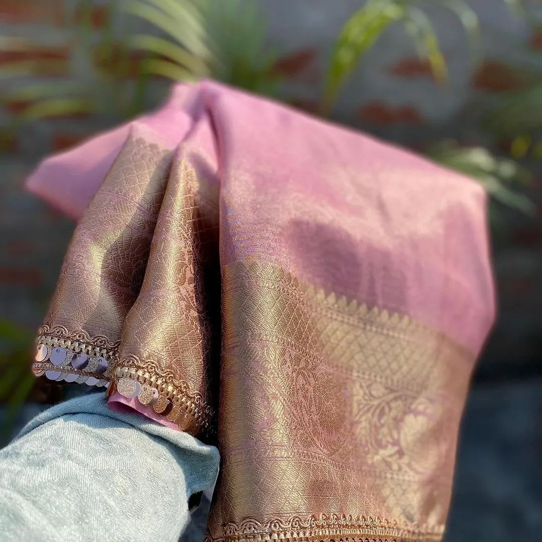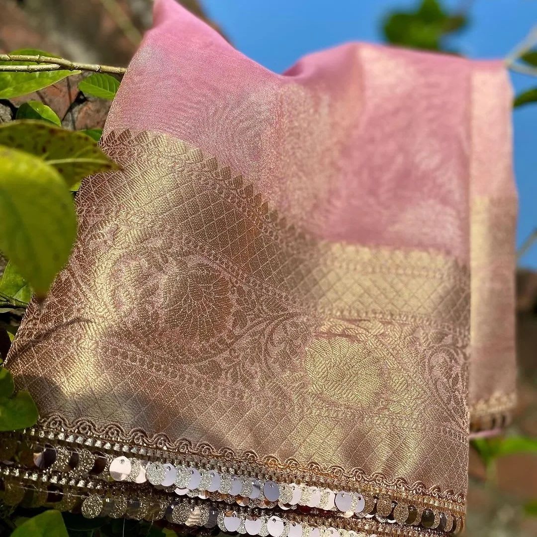 Fabric- Tissue Silk Saree Length- 5.5 Meter Blouse Length- 0.9 Meter Weight- 450 gms Care Instructions- Dry Clean Only