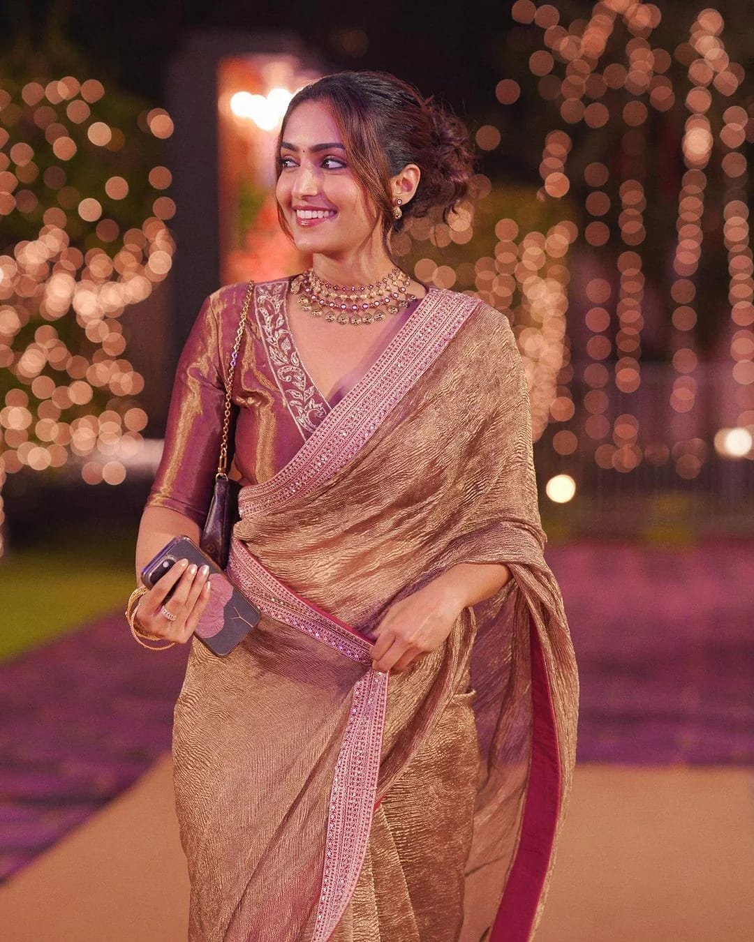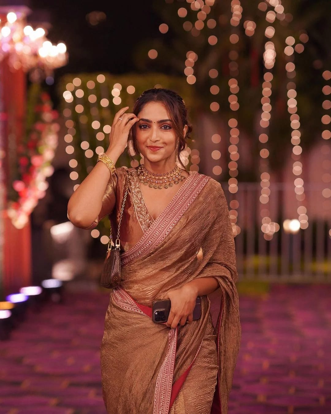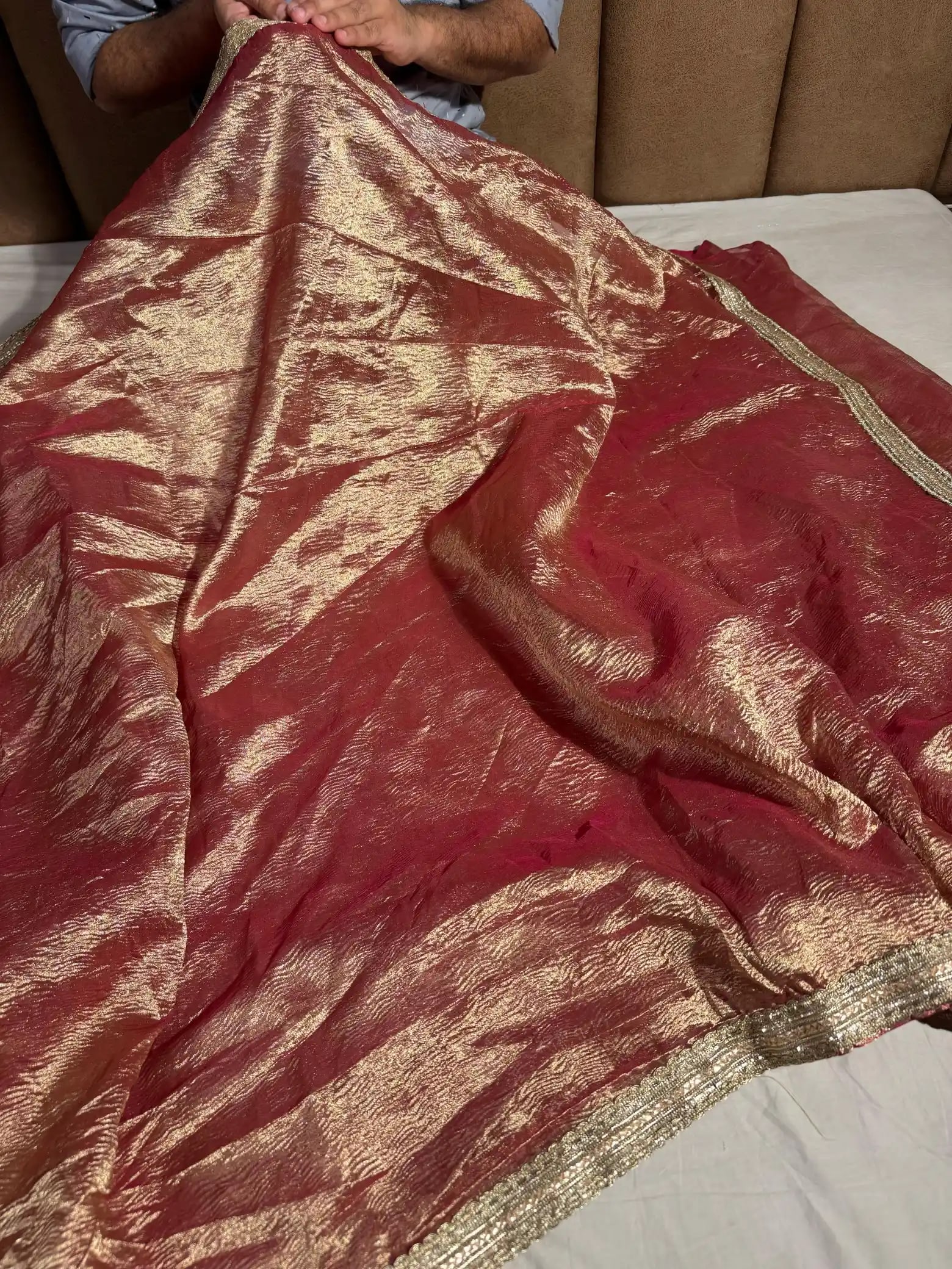 Tissue crush saree with lace border, inspired by Reba John’s graceful festive style. The fabric carries a soft sheen that catches light beautifully yet stays breathable and easy to drape. The lace adds just enough detail to keep it elegant without being too much — a lovely pick for haldi, mehendi, or even light festive dinners. It comes with an unstitched blouse piece in a matching tone for a complete look.