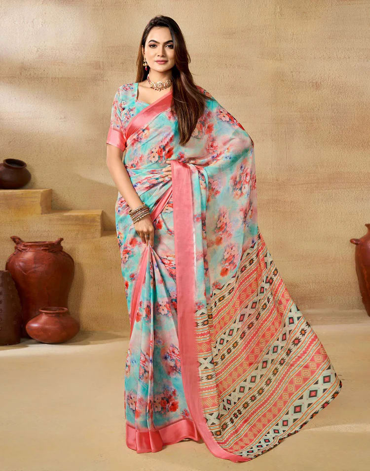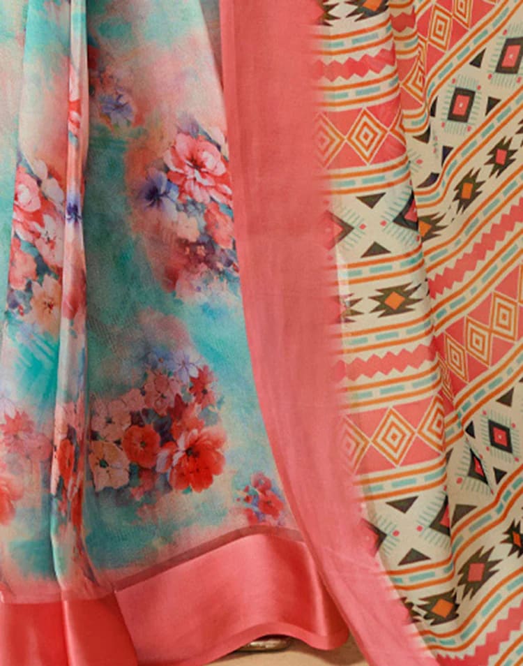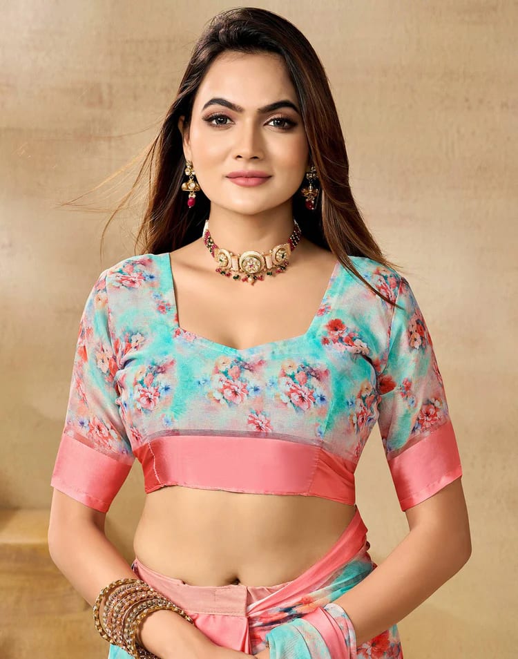Saree Fabric : Georgette Saree Color : Sea Green, Peach, Multicoloured Saree Work : Floral Printed, Sati Border (Ready To Wear) Saree Length : 5.50 Mtr Type : Floral Printed Blouse Color : Sea Green, Peach, Multicoloured Blouse Fabric : Georgette Blouse Work : Floral Printed, Satin Border Blouse Length : 0.80 Mtr Wash And Care : Hand Wash only. Do not dry in direct sunlight Size And Fit : The model height is 5.7 ft Sales Package : 1 Ready To Wear Saree With Attached Unstitched Blouse Weight : 0.49 Kg