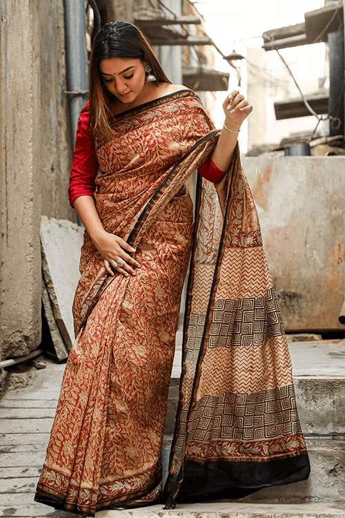 Adorned with Bagru hand block prints, this saree carries forward a 400-year-old legacy of natural dyeing and wooden block printing from Rajasthan. The intricate motifs and earthy tones highlight the meticulous craftsmanship that makes Bagru prints unique and treasured.
