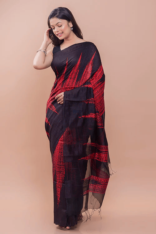 The striking black base enhanced with bold red shibori patterns adds a contemporary touch to traditional weaving, making the saree stand out as both artistic and timeless. Lightweight yet rich, it is suitable for festive occasions, formal events, and evening gatherings.