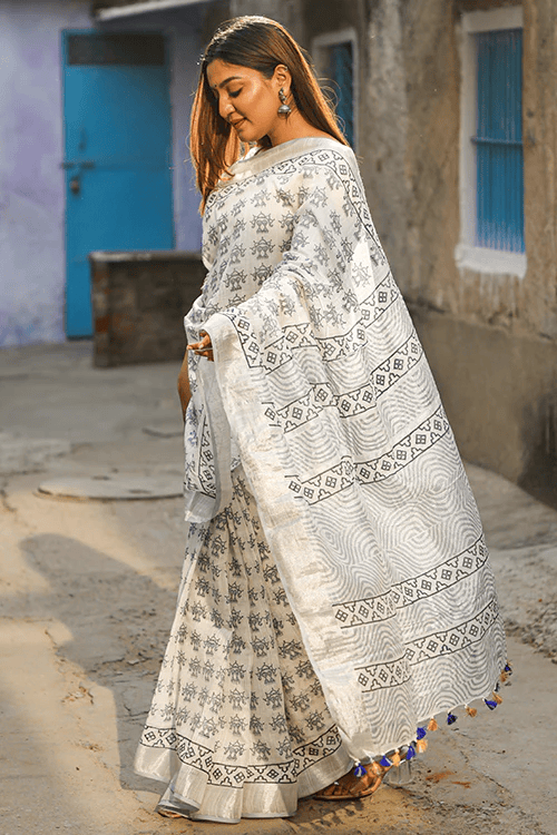 Adorned with hand block prints, this saree celebrates the artistry of skilled artisans who use carved wooden blocks and natural dyes to create timeless patterns. Its minimalist yet striking design makes it versatile for both casual and semi-formal occasions.