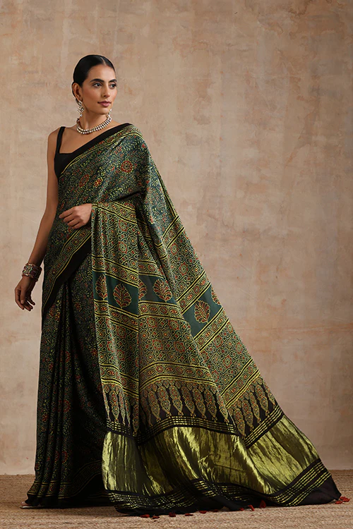 Adorned with Ajrakh hand block prints, the saree reflects centuries-old artistry from Kutch, with intricate motifs and natural dye work that elevate its regal appeal. The green base enhances the richness of the design, making it a striking choice for weddings, festive gatherings, and cultural functions.