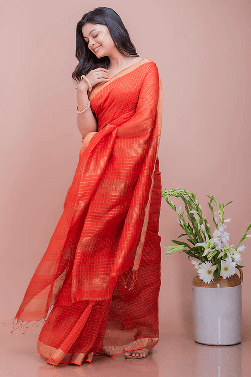 Step into timeless elegance with this Soft Bengal Handwoven Linen Silk Zari Saree in Deep Orange & Gold, a masterpiece that reflects Bengal’s rich weaving heritage. Crafted from a fine blend of linen and silk, the fabric combines the natural softness and breathability of linen with the sheen and grace of silk.