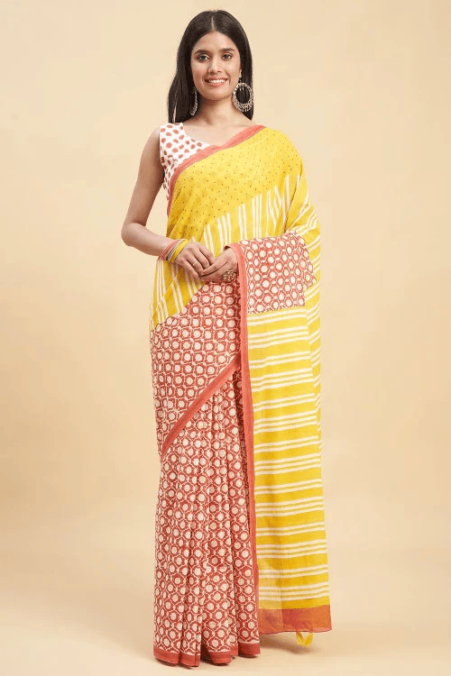 Handcrafted with traditional handblock printing, it features intricate motifs in a cheerful paradise yellow, symbolizing warmth, energy, and positivity. Each saree is a unique creation, carrying the mark of skilled artisans who keep this timeless craft alive.