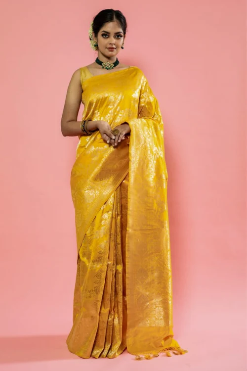 The bright yellow silk symbolizes celebration, joy, and prosperity, while the all-over jaal motifs enhance the grandeur of the drape. Lustrous, airy, and exquisitely detailed, this saree captures the spirit of Banaras’ weaving legacy.