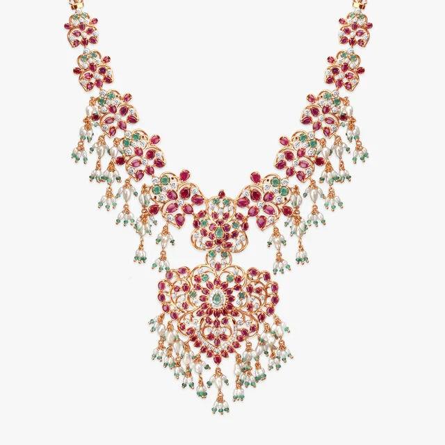 The Regal Bloom Diamond Necklace is a masterpiece of opulence, crafted in 18 Karat rose gold. This statement piece features an intricate floral arrangement of lush rubies and rich emeralds, accentuated by natural diamonds that enhance its regal charm. Cascading pearls add a finishing touch, lending a sense of movement and grace. Designed for those who appreciate grandeur, this necklace set is perfect for momentous occasions, exuding sophistication and timeless allure.