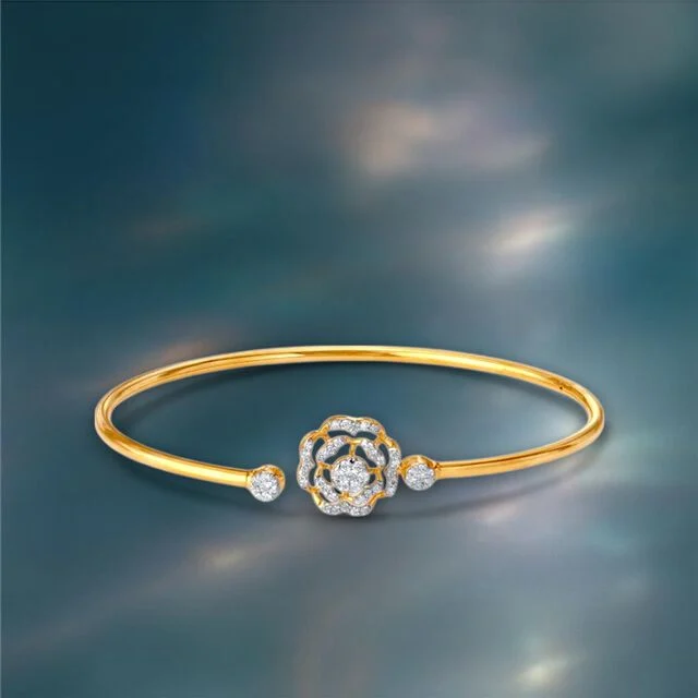 A blooming beauty in every sense, the Sparkling Rosette Diamond Bangle is all about refined sparkle and feminine charm. Its elegant floral motif is accentuated with shimmering natural diamonds, creating a captivating centrepiece. Crafted in yellow gold, this bangle is ideal for girls who appreciate subtle yet stylish jewellery. Whether paired with a festive outfit or worn as a chic daily accessory, it offers a graceful touch that stands out.