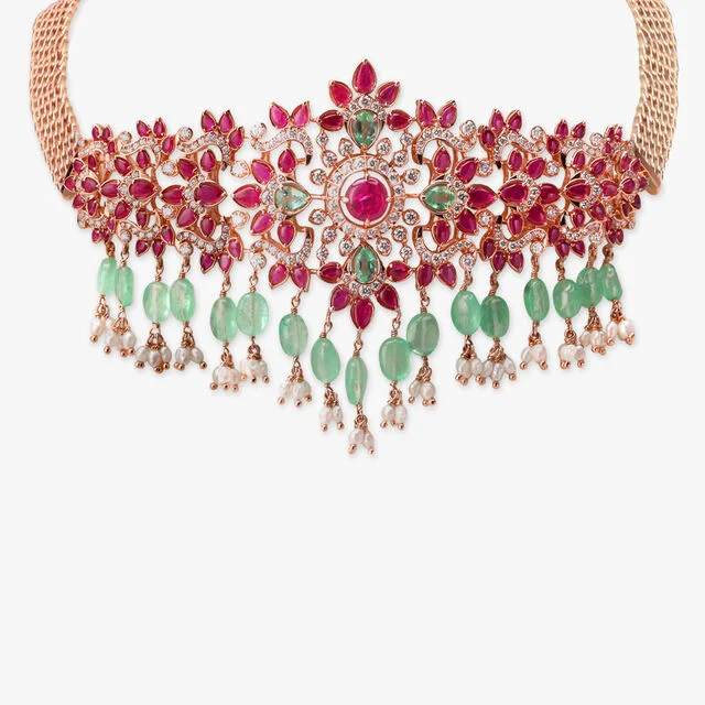Crafted in 18 Karat rose gold, the Verdant Cascade Diamond Necklace is a stunning display of artistry and luxury. Adorned with natural diamonds, rubies, emeralds, and pearls, this exquisite piece features an intricate arrangement of floral motifs, enhanced by delicate beadwork that cascades gracefully. The vibrant gemstones create a striking contrast, adding depth and brilliance to the design. Perfect for grand occasions, this choker embodies regal charm and timeless elegance, making it an essential addition to any fine diamond jewelry collection.