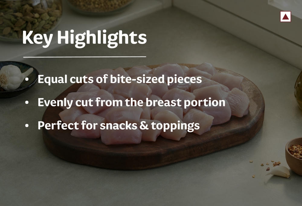 Fresh pack of boneless and buttery chicken pieces cut in cubes. Soft, slimy breast portions cut in uniform shapes are easy to evenly cook.