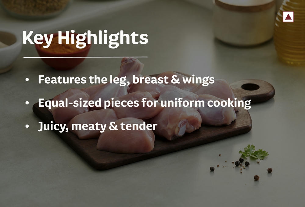 Chicken Curry Cut is a premium cut that includes the leg, breast & wings. This smaller, tender cut has equal-sized pieces for uniform cooking and the juiciest bites.
