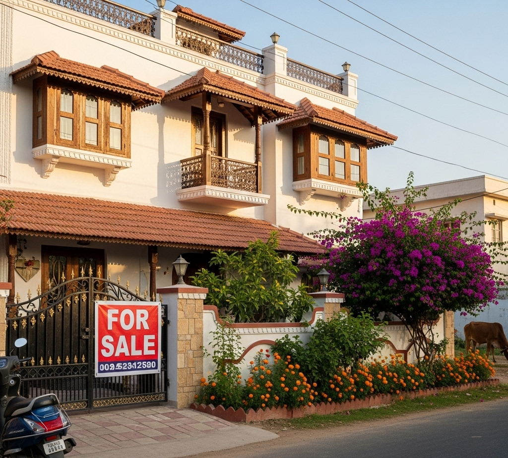 Charming two-story house in a serene Indian neighborhood is available for sale. The house boasts traditional architectural elements such as wooden window canopies and balconies, complemented by a white exterior and a terracotta-tiled roof. A well-maintained garden with vibrant orange marigolds and a lush purple bougainvillea adds to the property's appeal. The house is secured by a black iron gate with a visible "FOR SALE" sign displaying contact information. A blue scooter is parked outside, and a glimpse of a cow in the background suggests a peaceful environment. The overall ambiance is inviting and reflects a comfortable family home.