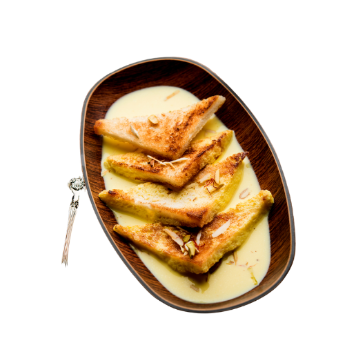 A Hyderabadi royal bread pudding made with milk, saffron, and dry fruits.